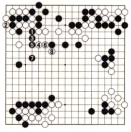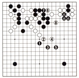 Black caps with 1 and it seems as if he is building influence in the center while forcing White to run away with 2 and 4. Black keeps up the pressure with 5, but suddenly White plays a forcing move with 6 and jumps to 8, splitting the marked stones from their allies on the left. Black now has two weak groups and it is hard to tell who is the attacker and who is the one being attacked. Both sides are in for a hard fight and the outcome is far from clear. (Taken from Problems 50 and 135.) If Black already had a stone at 8, Black 3 and 5 would be a devastating attack and White would be crushed.