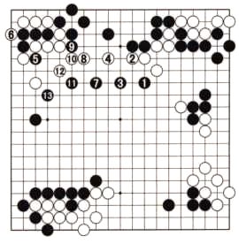 Black has strong positions at the top and on the right, which he uses to attack the four white stones at the top with 1. White runs away with 2, 4, and 8, hoping to link up with his secure position in the upper left corner, while Black presses with 3 and 7. Note that the value of each of White's moves is zero. In contrast, Black is building influence that radiates throughout the board. Clearly, Black's moves must be good! Black 5 and 9 exploit the aji of his four dead stones in the corner, and Black 11 forces White to defend at 12. Finally, Black plays 13 and his influence dominates the center and works beautifully with his wall below. This is a textbook example of an attack.