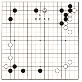 What about capping at Black A? This cap is the kind of severe attacking move that often succeeds, but here White will be able to break out by extending diagonally to D. Black's stones on the left will become strong and he will secure the territory there. But White will escape into the center and Black's wall on the left will not have been used effectively.
