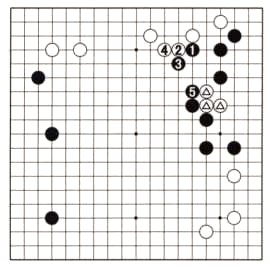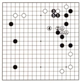 The three marked white stones in Dia. 5 are under siege, but Black's stones are not strong enough to trap them. Therefore, he switches to the top and attaches with 1. If White defends with 2, Black hanes with 3. After White defends with 4, Black comes back to finish off the marked stones with 5. They can no longer escape and they don't have enough room on the right to live.